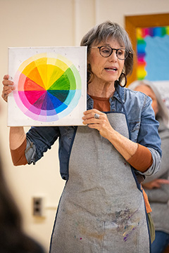 Local artist Carolyn King teaches Ochoa students to create banners for their school's upcoming 100th birthday celebration.